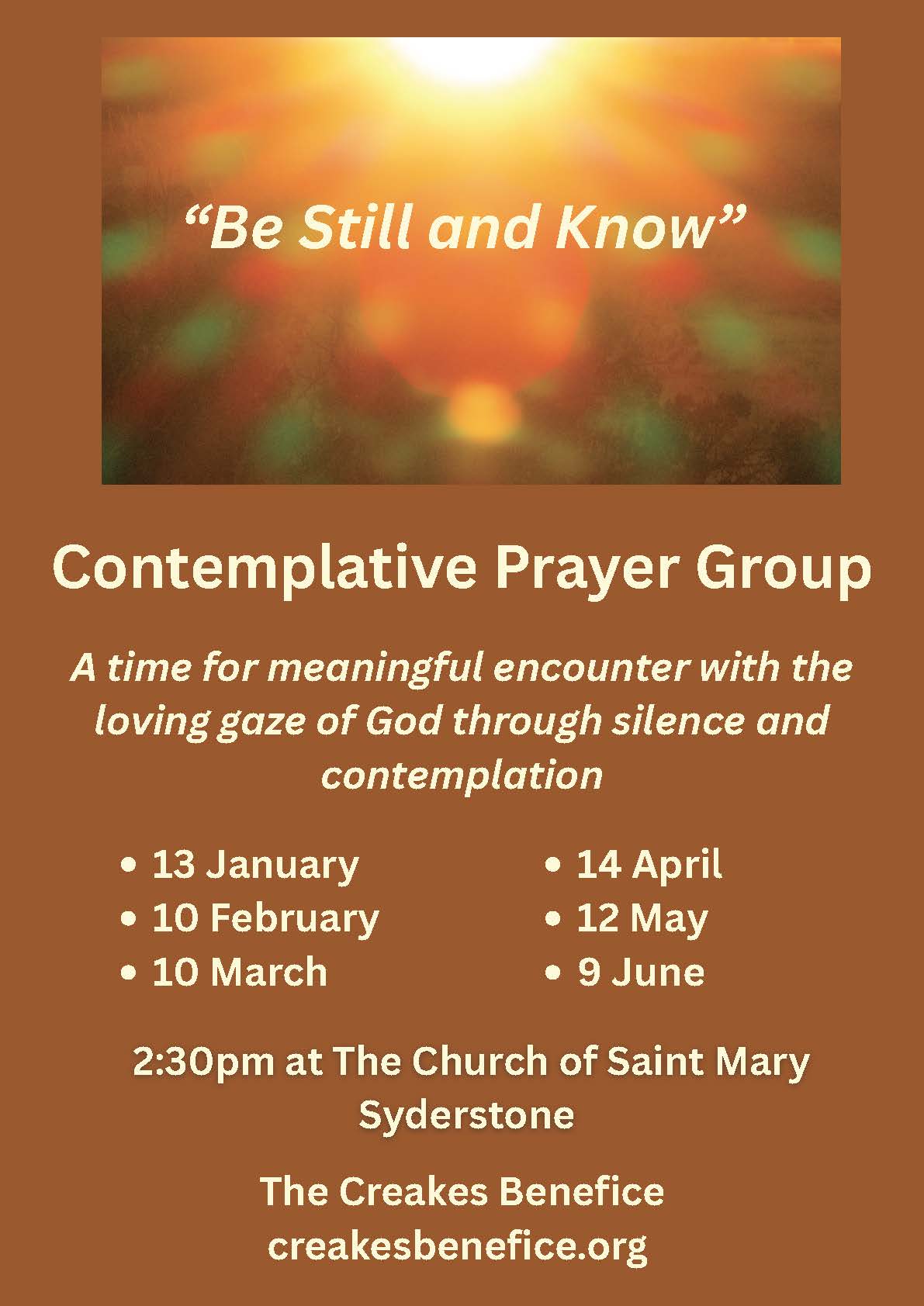 Join the Contemplative Prayer Group! A time for meaningful encounter with the loving gaze of God through silence and contemplation. 13 January 10 February 10 March 14 April 12 May 9 June 2:30pm at The Church of Saint Mary Syderstone Cake, coffee and tea are served afterwards.