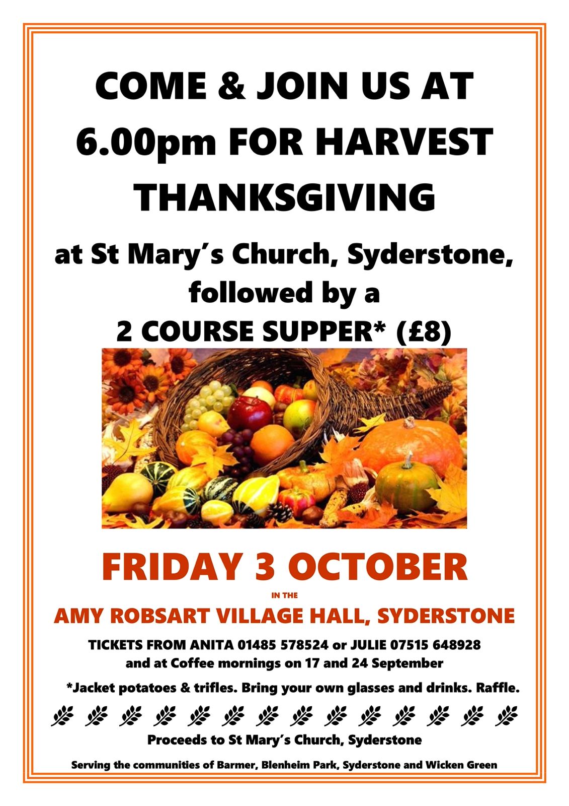 Come and join friends from across the benefice at the annual Harvest Thanksgiving at 6pm on Friday 3 October at the Church of Saint Mary Syderstone. This is followed by a two course supper for £8 at the Amy Robsart Village Hall. On the menu are yummy jacket potatoes and trifles. Bring your own glasses and drinks. A fun raffle will also be held. Tickets are available from Anita and Julie, and at Syderstone coffee mornings. Proceeds support the Church